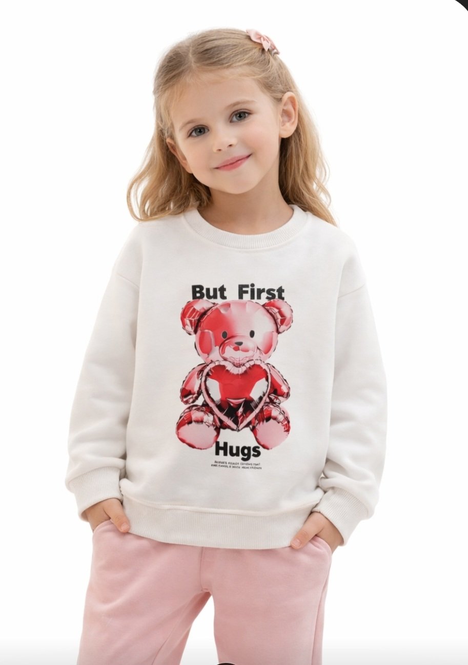 Η μπλούζα είναι παιδική, σε ανοιχτό χρώμα (εκρού/λευκό), με τύπωμα ενός ροζ μεταλλικού αρκουδιού που κρατάει μια καρδιά. Πάνω γράφει “But First Hugs”. Έχει μαλακή ύφανση και λάστιχο στα μανίκια και στο τελείωμα.