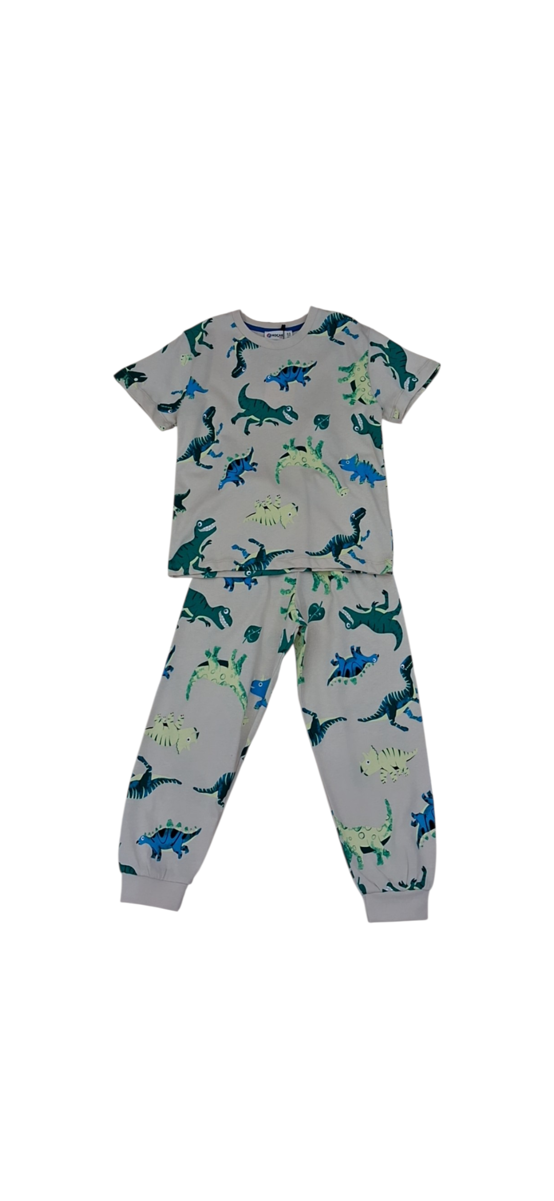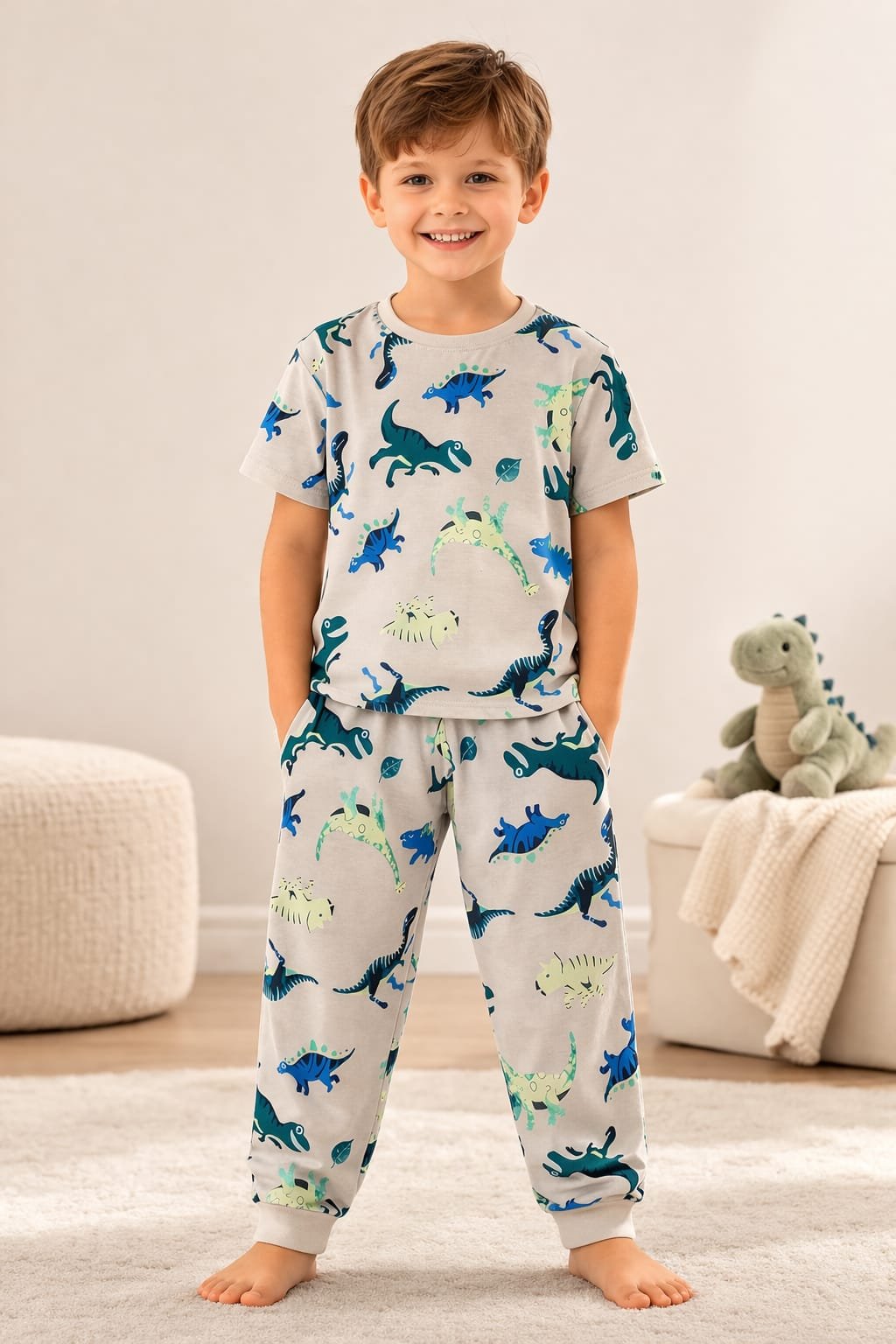 Το σετ περιλαμβάνει κοντομάνικη μπλούζα και μακρύ παντελόνι, διακοσμημένα με πολύχρωμους δεινόσαυρους σε αποχρώσεις του πράσινου και του μπλε. Το ύφασμα είναι απαλό και άνετο, ιδανικό για ήρεμο και ευχάριστο ύπνο.