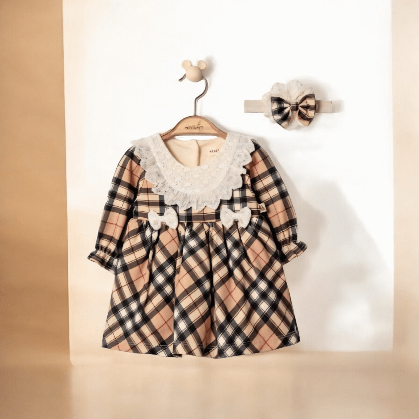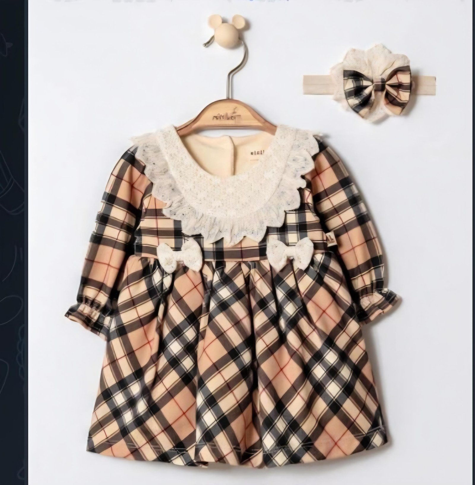 Ένα υπέροχο βρεφικό φορεματάκι σε κομψό καρό σχέδιο, σε απαλές αποχρώσεις μπεζ, σομόν και μαύρου. Διαθέτει εντυπωσιακό δαντελένιο γιακά που χαρίζει ρομαντική πινελιά, καθώς και διακριτικά φιογκάκια στο μπροστινό μέρος για extra γλυκύτητα. Τα μακριά μανίκια προσφέρουν άνεση και ζεστασιά, ενώ συνοδεύεται από ασορτί κορδέλα μαλλιών για ολοκληρωμένο και καλαίσθητο σύνολο. Ιδανικό για βόλτες, γιορτές και ξεχωριστές εμφανίσεις του μωρού σας. 💕