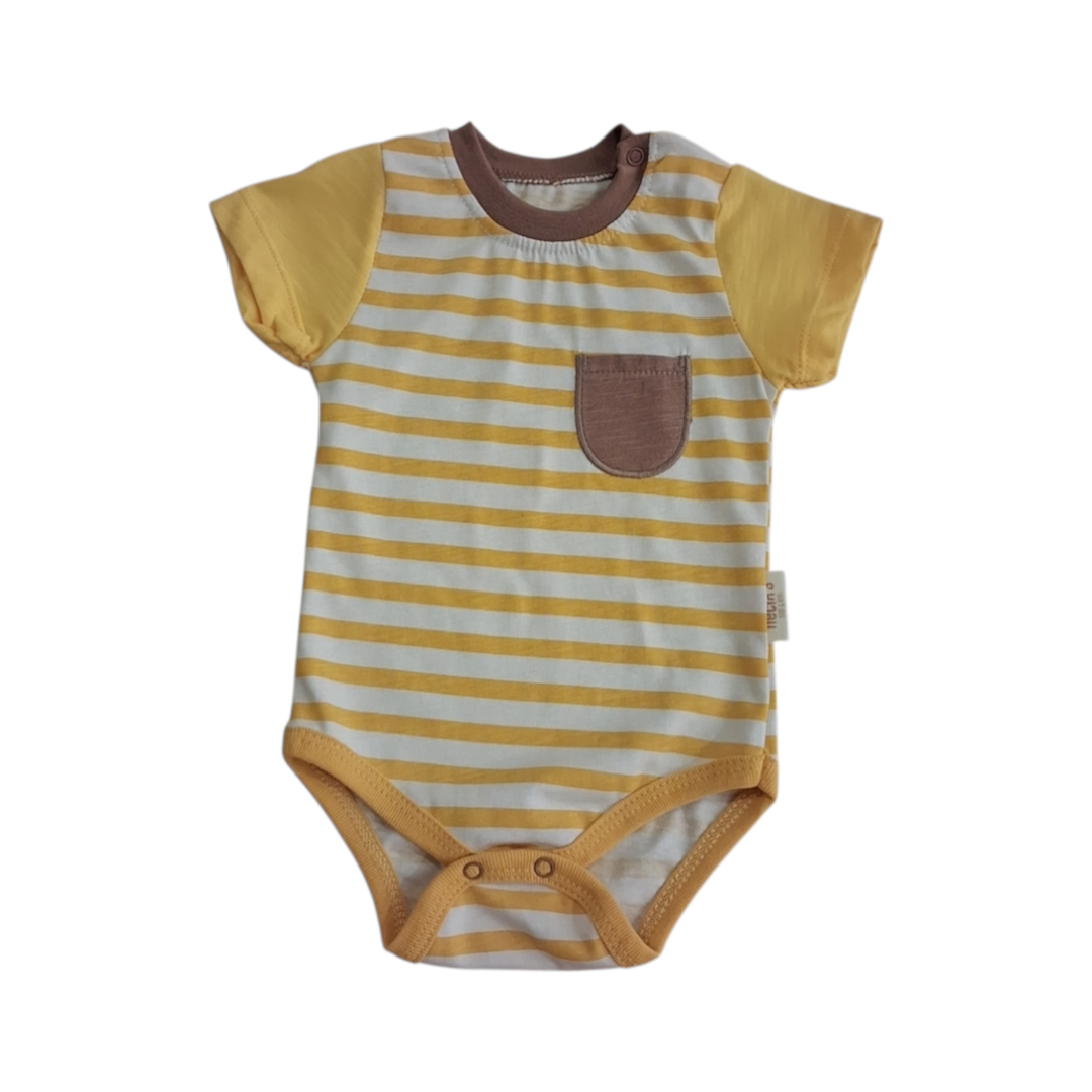 Με κίτρινες και λευκές ρίγες, μονόχρωμα μανικάκια και ένα μικρό καφέ τσεπάκι στο στήθος, προσφέρει μια γλυκιά και μοντέρνα εμφάνιση στο μωρό σας.