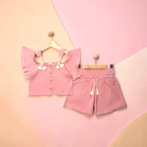 Ένα υπέροχο και κομψό καλοκαιρινό σετ για μικρές πριγκίπισσες! Το σύνολο αποτελείται από μπλούζα με εντυπωσιακά βολάν στους ώμους και διακοσμητικά κορδονάκια με φουντάκια, καθώς και άνετο σορτσάκι με λάστιχο στη μέση για τέλεια εφαρμογή. Το απαλό ροζ χρώμα χαρίζει μια ρομαντική και γλυκιά εμφάνιση, ιδανική για καθημερινές βόλτες αλλά και πιο ξεχωριστές στιγμές.