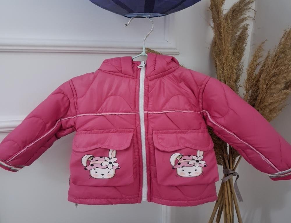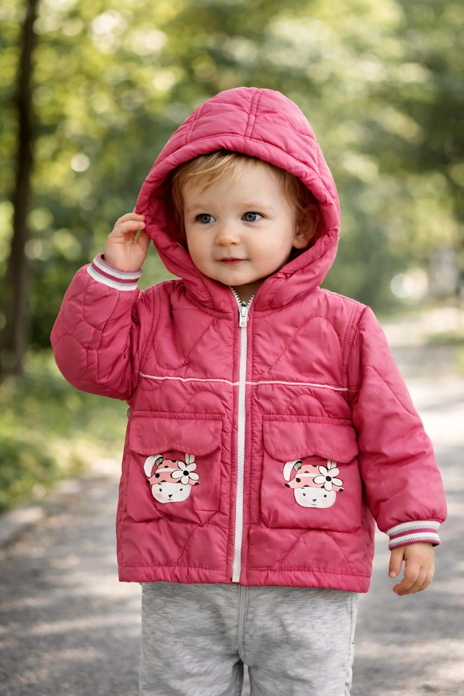 Διαθέτει φερμουάρ στο μπροστινό μέρος για εύκολο ντύσιμο και δύο εμπρόσθιες τσέπες με παιχνιδιάρικα σχέδια ζωάκια που φορούν λουλουδάτο καπελάκι — μια λεπτομέρεια που προσθέτει γλυκύτητα και στυλ. Η κουκούλα προσφέρει επιπλέον προστασία από το κρύο, ενώ τα ραμμένα τελειώματα εξασφαλίζουν ανθεκτικότητα στη χρήση.