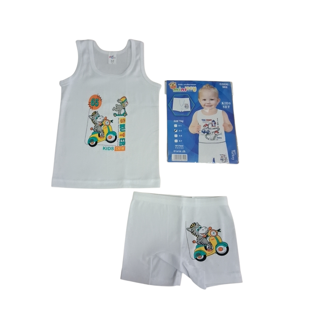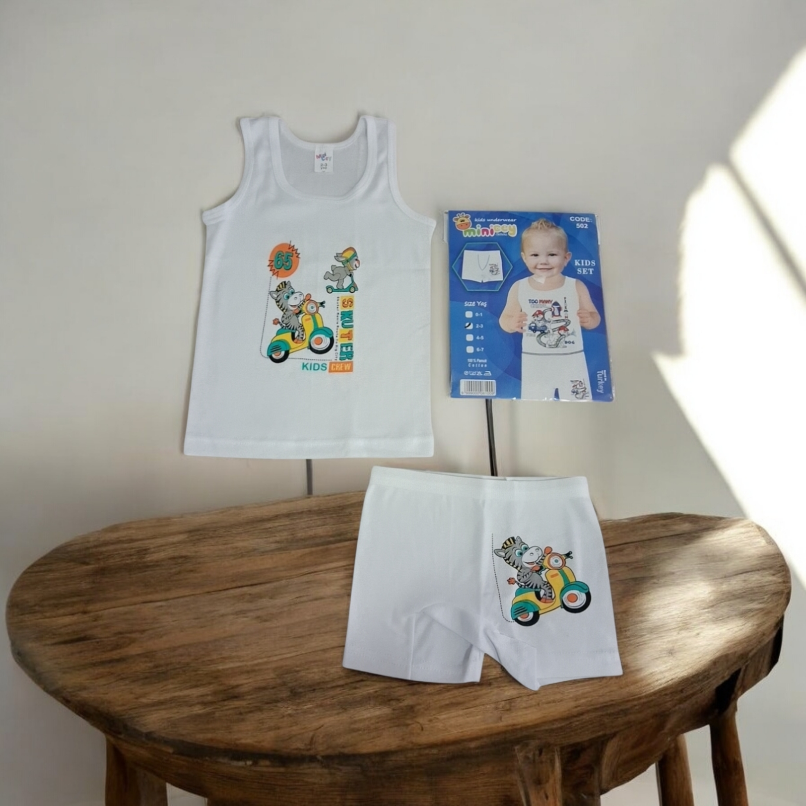 Ένα παιχνιδιάρικο και άνετο σετ εσωρούχων για αγοράκια, σε λευκό χρώμα και απαλή βαμβακερή ποιότητα. Το σετ περιλαμβάνει αμάνικο φανελάκι και σορτσάκι, διακοσμημένα με χαριτωμένη ζέβρα που οδηγεί πατίνι σε ζωηρά χρώματα. Ιδανικό για καθημερινή χρήση, προσφέρει άνεση, δροσιά και ελευθερία κινήσεων. Ένα σετ που συνδυάζει πρακτικότητα και χαρούμενο παιδικό στυλ!