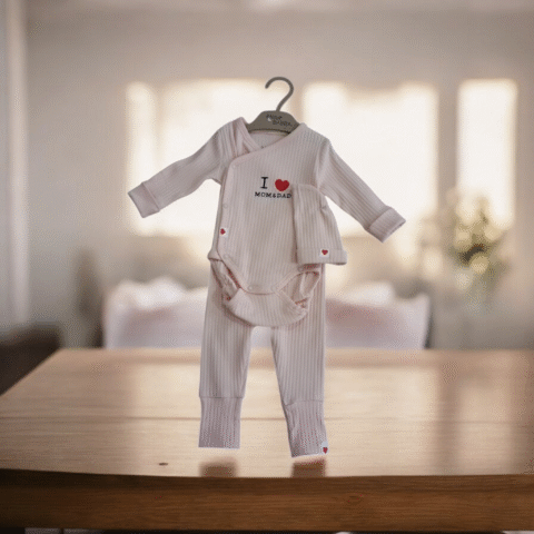 Υπέροχο βρεφικό σετ 3 τεμαχίων σε απαλό ροζ χρώμα, που περιλαμβάνει κορμάκι, παντελονάκι και σκουφάκι. Το κορμάκι έχει σταυρωτό κλείσιμο με κουμπάκια και την τρυφερή στάμπα “I ❤️ Mom & Dad”. Το παντελονάκι και το σκουφάκι διαθέτουν διακριτικές λεπτομέρειες με καρδούλα, χαρίζοντας επιπλέον γλύκα στο σύνολο. Φτιαγμένο από απαλό, βαμβακερό ύφασμα για απόλυτη άνεση και ζεστασιά στο μωράκι σας.