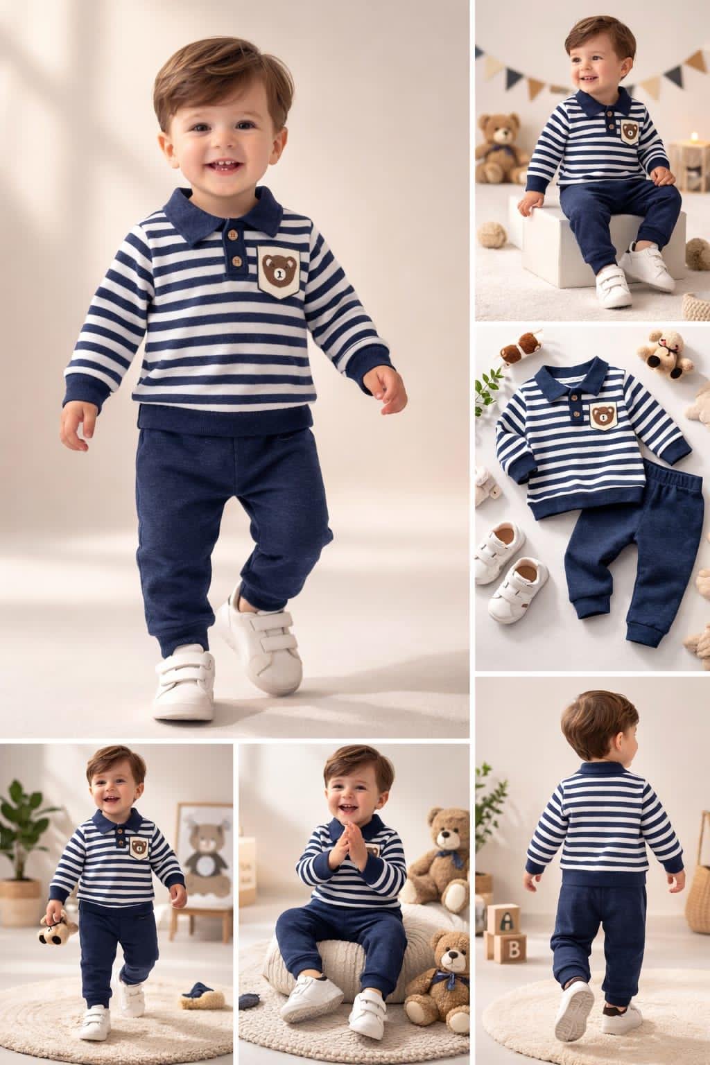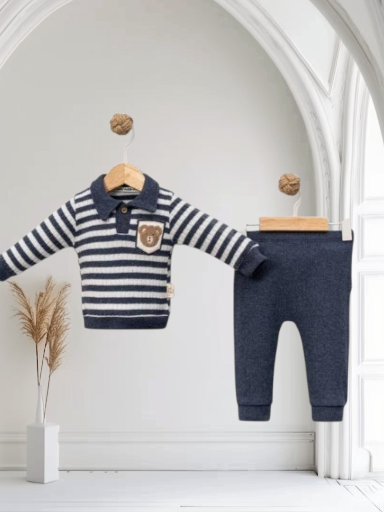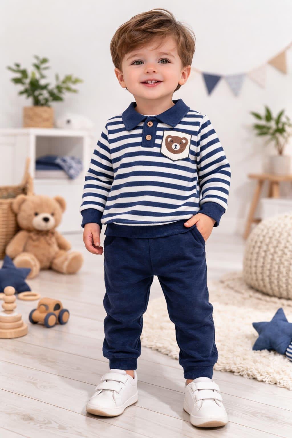 Κομψό και άνετο σετ βρεφικής φόρμας, ιδανικό για τις καθημερινές εμφανίσεις του μωρού σας. Αποτελείται από ριγέ μπλουζάκι σε αποχρώσεις μπλε και λευκού, με γιακά και χαριτωμένο κεντημένο αρκουδάκι στο στήθος, καθώς και μονόχρωμο μπλε παντελονάκι με λάστιχο για άνετη εφαρμογή. Κατασκευασμένο από απαλό και ζεστό ύφασμα, προσφέρει άνεση και ελευθερία κινήσεων, ιδανικό για βόλτες και παιχνίδι. 💙🐻