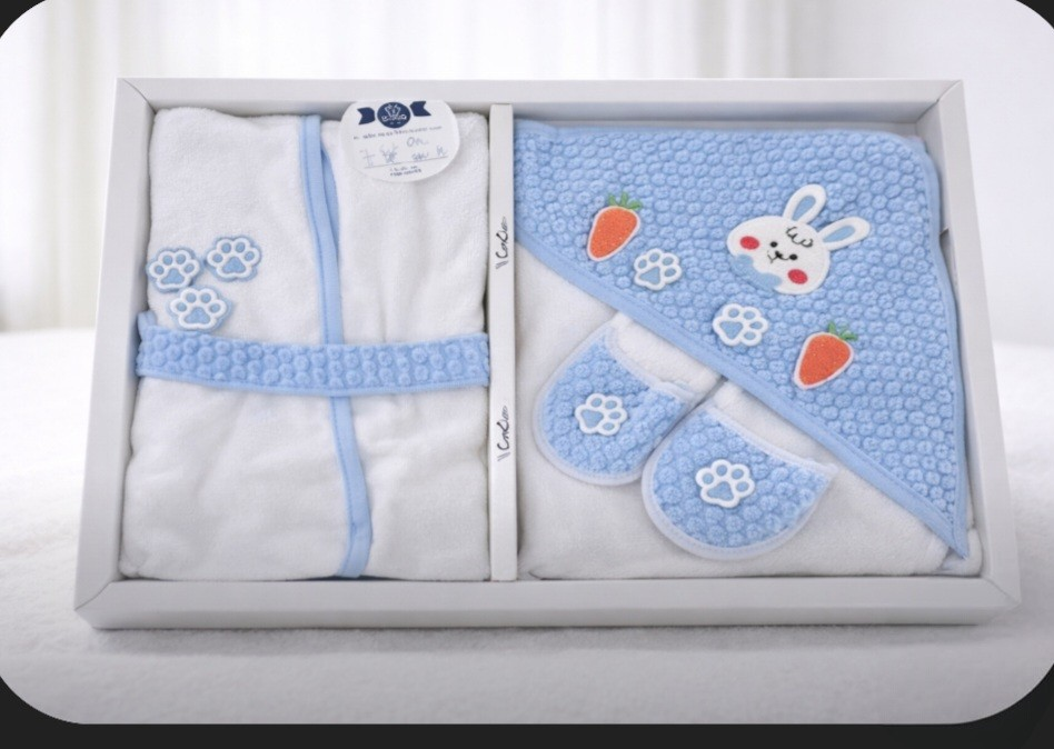 Το σετ περιλαμβάνει κουβερτούλα, πετσέτα με κουκούλα και παντοφλάκια, όλα σε απαλή απόχρωση του μπλε με χαριτωμένο σχέδιο κουνελάκι και φραουλίτσες.