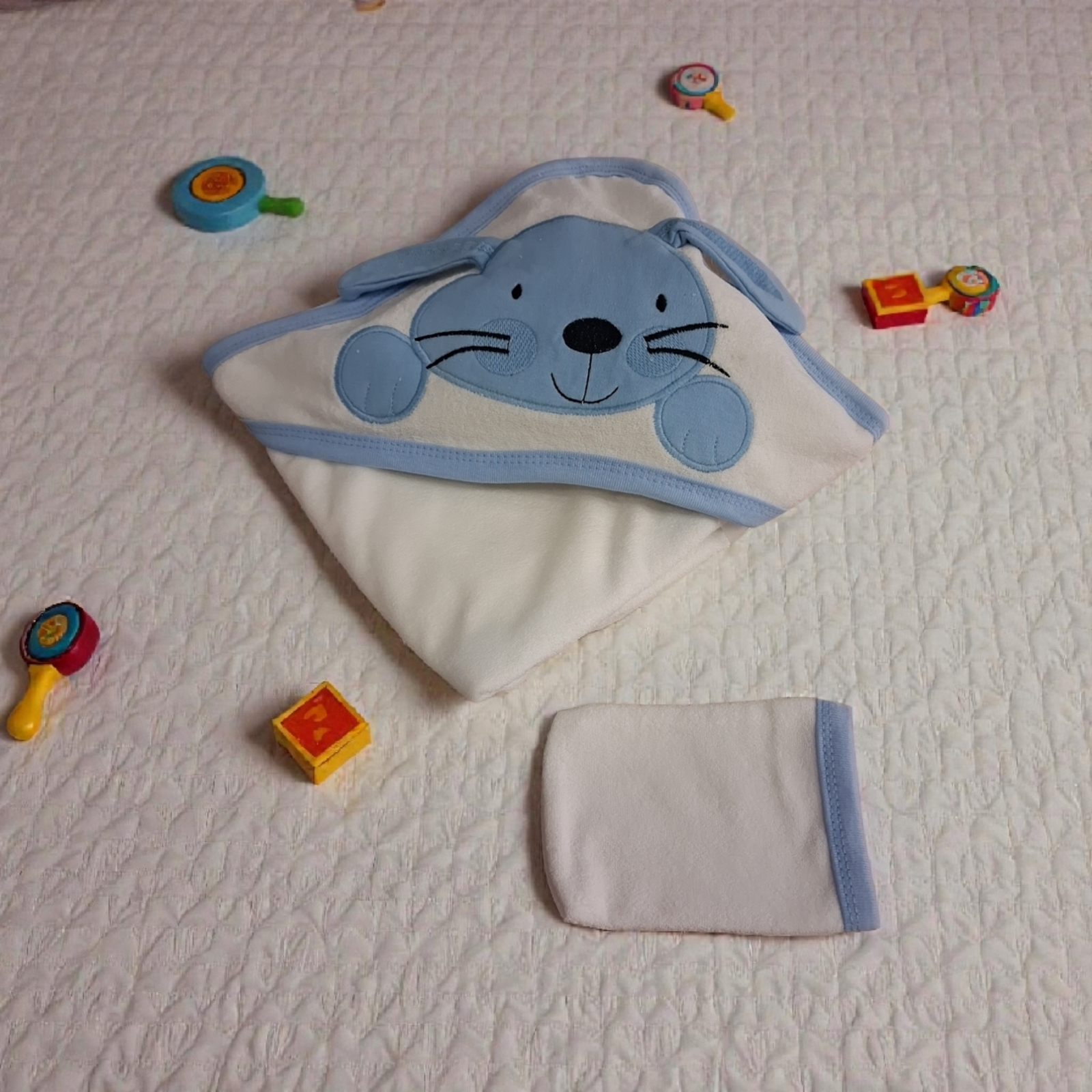 Χαρίστε στο μωράκι σας ζεστασιά και απαλότητα με αυτή τη βρεφική πετσέτα αγκαλιάς σε λευκό χρώμα με γαλάζιες λεπτομέρειες και χαριτωμένο ζωάκι στην κουκούλα. Είναι ιδανική για μετά το μπάνιο, αγκαλιάζει τέλεια το μωρό και στεγνώνει απαλά χωρίς να ερεθίζει την επιδερμίδα. Συνοδεύεται από μικρή πετσέτα–γαντάκι για ακόμα πιο εύκολη περιποίηση. Ένα πρακτικό και γλυκό σετ για κάθε μαμά και μωρό!