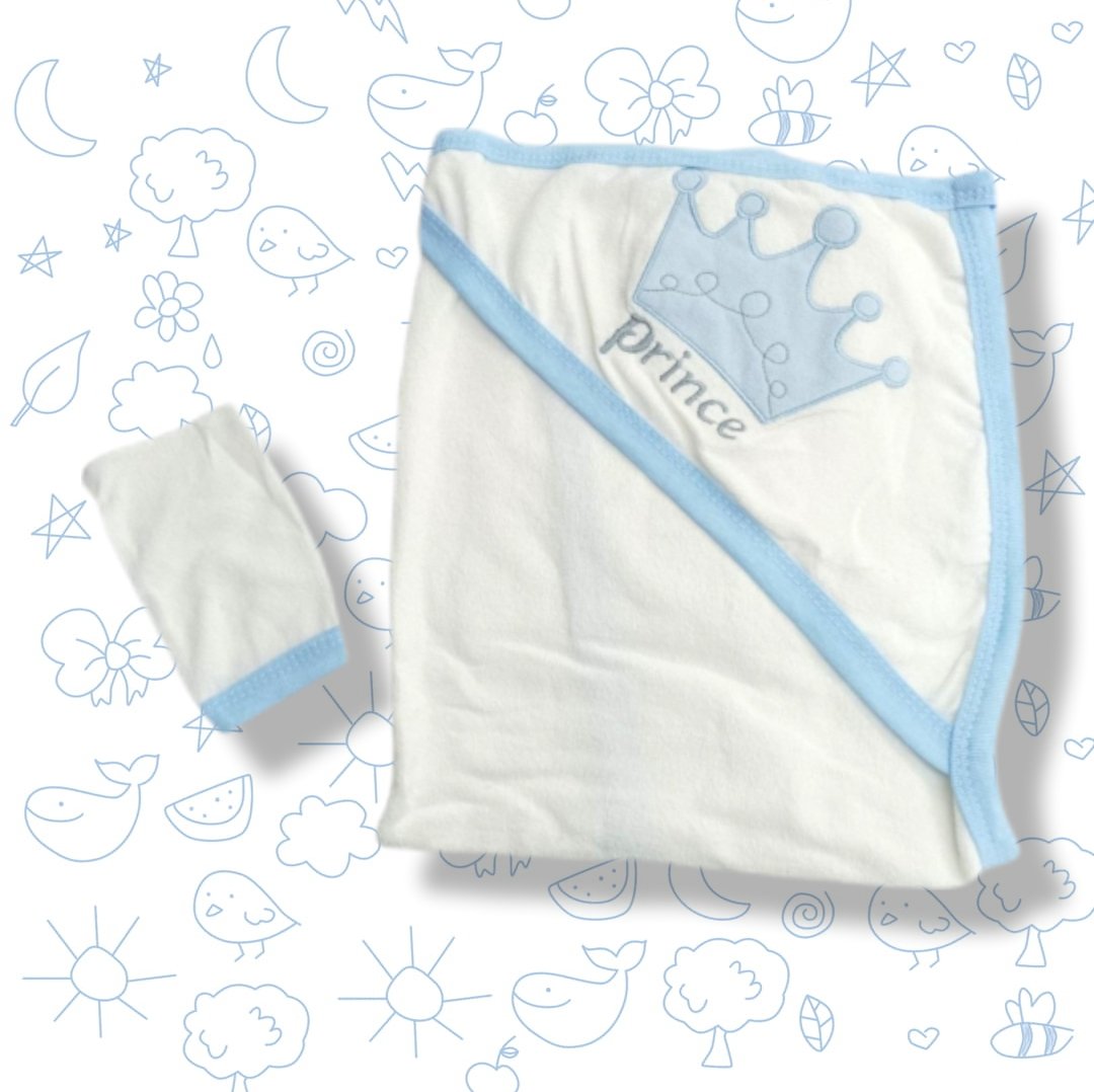 Απαλή και απορροφητική βρεφική πετσέτα με κουκούλα, ιδανική για το μπάνιο του μικρού σας πρίγκιπα! Διαθέτει χαριτωμένο σχέδιο με κορώνα και τη λέξη “Prince”, σε γαλάζιο χρώμα που προσθέτει στυλ και γλυκύτητα. Κατασκευασμένη από μαλακό βαμβακερό ύφασμα, στεγνώνει απαλά το ευαίσθητο δέρμα του μωρού, προσφέροντας άνεση και ζεστασιά. Περιλαμβάνει και μικρό γαντάκι για ολοκληρωμένη φροντίδα μετά το μπάνιο.