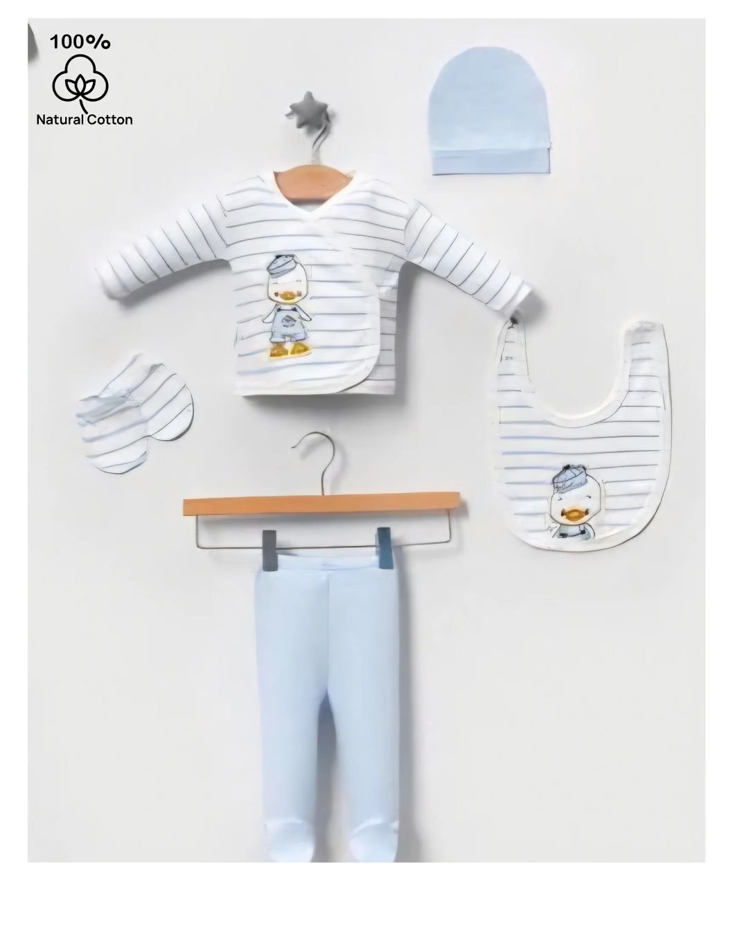 Υπέροχο βρεφικό σετ 5 τεμαχίων, ιδανικό για τις πρώτες μέρες του μωρού. Κατασκευασμένο από απαλό και ποιοτικό ύφασμα που προσφέρει άνεση και προστασία στην ευαίσθητη επιδερμίδα του μωρού.