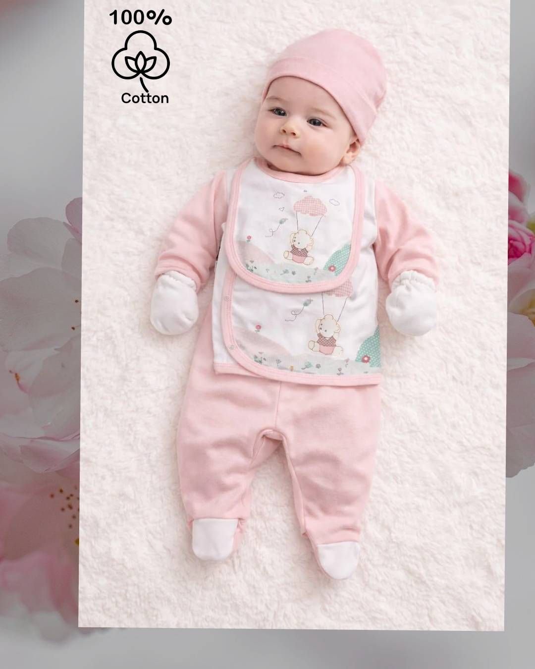 Βρεφικό Σετ 5 Τεμαχίων Ροζ με Αρκουδάκι – Απαλό & Γλυκό για Νεογέννητο 0-3 μηνών 100 cotton